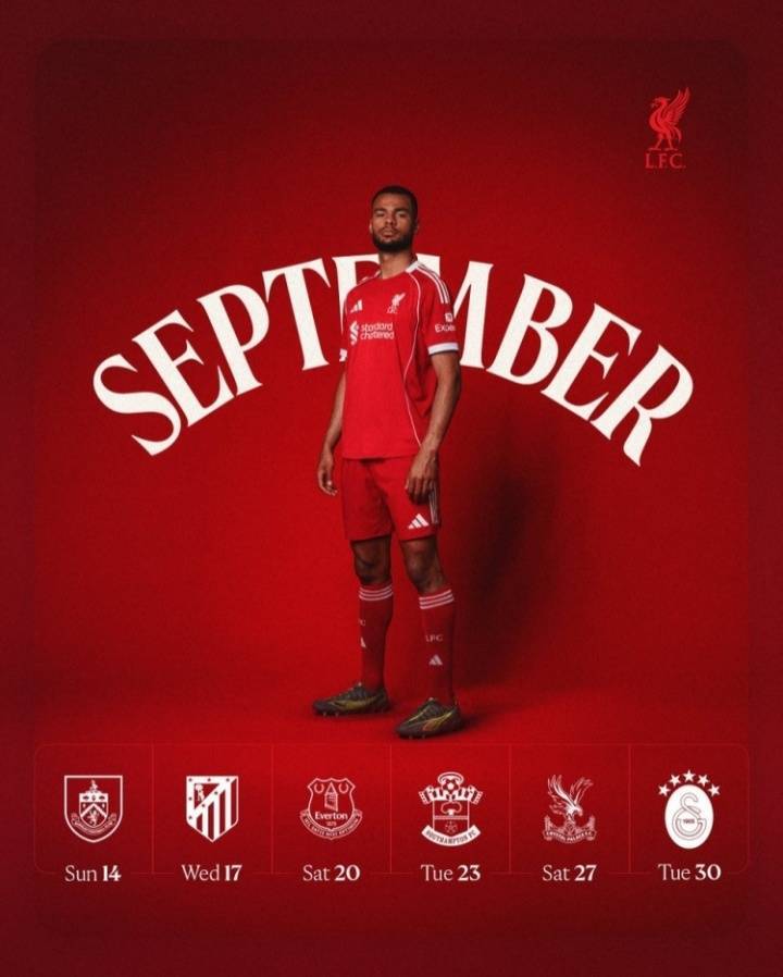 利物浦9月:14日伯恩利、18日马竞、20日埃弗顿、24日南安普顿、27日水晶宫